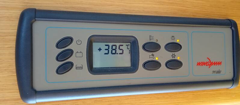 Der Temperaturfühler für die Womo-Anzeige sitzt direkt unter der Zugangstür. Diese steht offen und somit ist das auch verwertbar, da nur Luft und keine direkte Sonneneinstrahlung den Sensor trifft. Würde man direkt unter der Decke messen - das Schneckenhaus lädt sich schon sehr stark auf den Tag über. Nachts ist es dennoch noch erträglich, da wir "noch" nicht über die 20°C Marke gegangen sind.