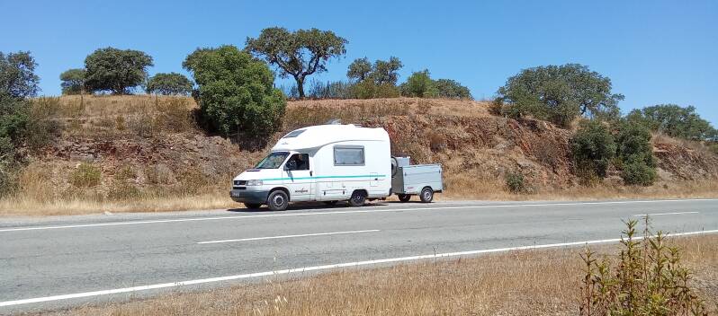 Die Wohnmobiltechnik hat bis hier hin tadelos funktioniert. Der Wingamm kann auch Dauereinsatz! Der T4 hat bis auf das Schaltproblem die nicht immer so tollen Landstraßen sehr gut gemeistert und schnurrt bei 9Liter Verbrauch stoisch. Die Fahrräder sind nach überstandenen Drama beste Begleiter. Apropos Begleiter: Mr. Crab geht es gut er hat von mir eine Überarbeitung für mehr Stabilität bekommen. Das Amaturenbrett ist ein rauhes Pflaster! Ach genau, mir geht's auch gut. Ich werde brauner, ich lerne immer noch wann und wo Sonnenschutz ausreicht und eben nicht.
