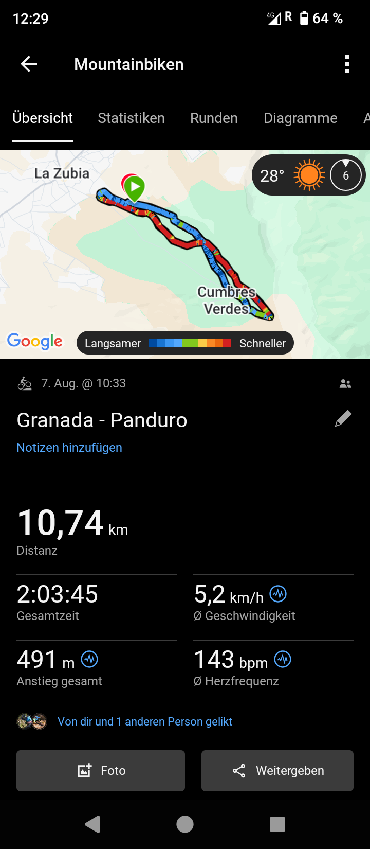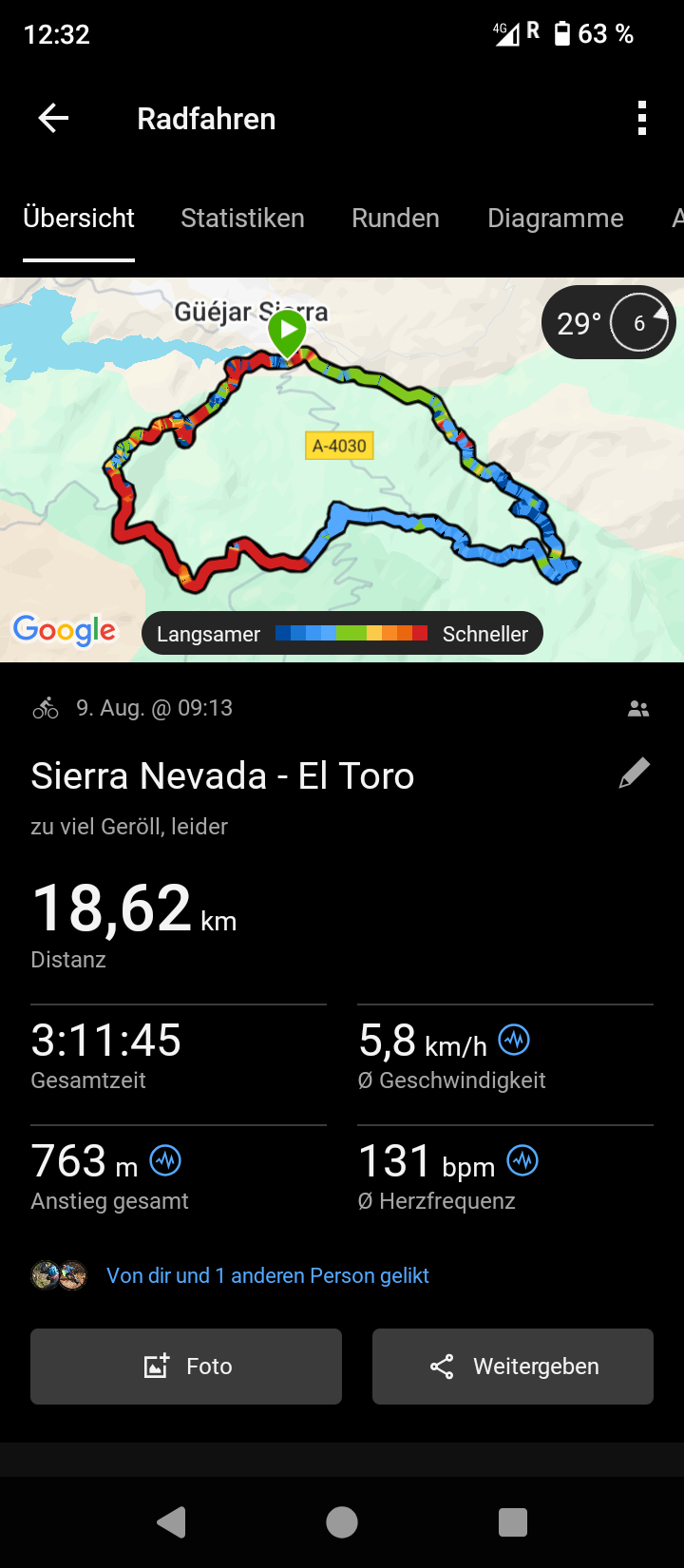 Nicht weit von Granada kurz hinter einem Stausee gelegen campiere ich für zwei Nächte am Berg. Eigentlich direkt an der Passstraße, welche zum Ort Pradollano auf 2500m ü.M. führt, steht es sich super und der Verkehr hält sich in Grenzen. Umso später umso weniger und Nachts eigentlich gar kein Verkehr! Ich will hier zwei Trailrunden fahren und geworden ist es dann nur eine, die war aber sehr schön und auch ausreichend. Es ist einfach zu heiß wenn man nicht schon um acht im Sattel sitzt und der Schweinehund hat mich wollen nicht noch einmal so früh aufstehen lassen, ist ja schließlich Urlaub haha!