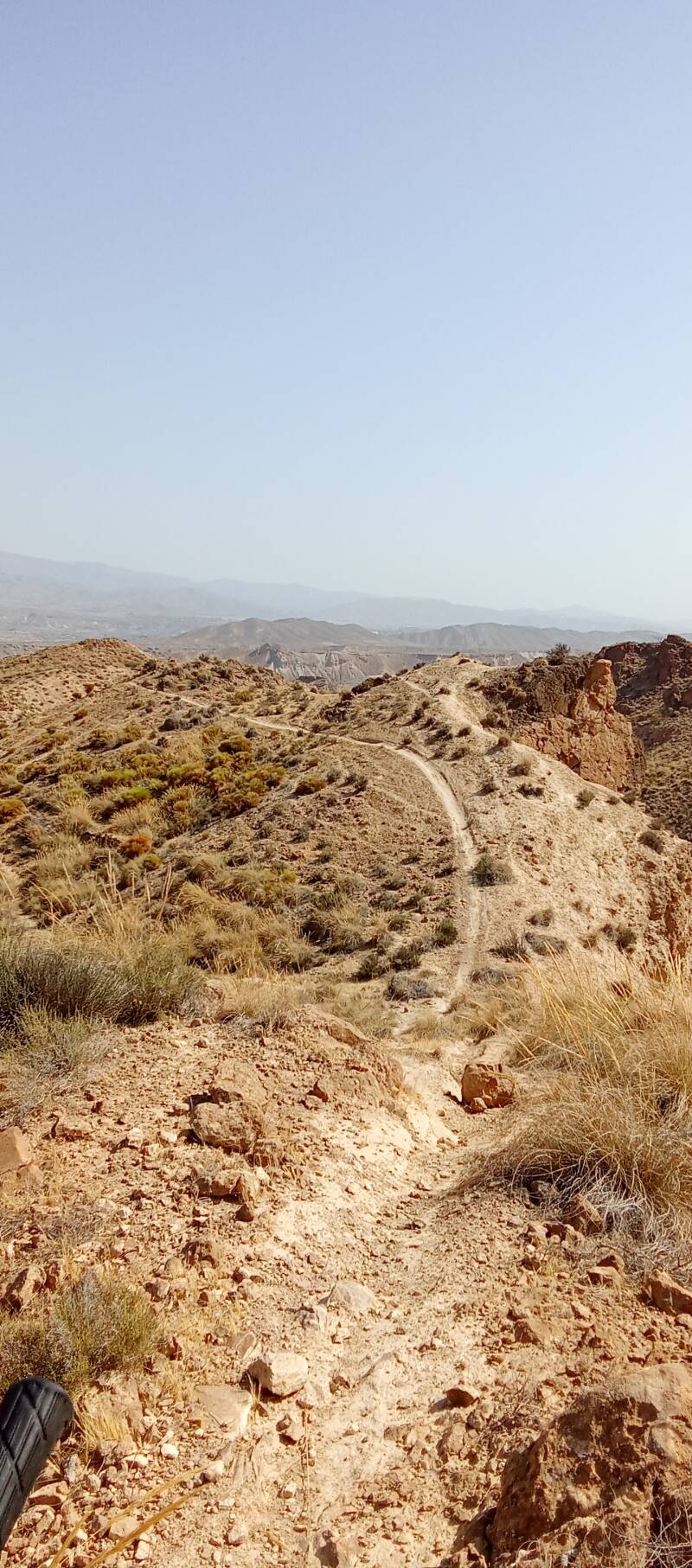 Die Desierto stand also an. Die Landschaft ist vorsichtig gesagt, mehr auf der trockenen Seite einzuordnen. Die Bäume sind halt eher größere Büsche und wenn mal was ganz groß wächst sind es Palmen in Oasen. So viel anderst waren Marokkos Berge und Täler jetzt auch nicht, denke ich mir immer öfter mal. Doch trotzdem ist es deutlich anderst und erinnert total an die Bilder die man von Arizona und Utah so gesehen hat. Schön! Schön ist auch die Filmvergangenheit der Wüste, denn hier wurden unzählige Western und andere Filme gedreht. Das ist auch der Grund für gleich drei "Filmstädte" auf einem Fleck, die alle um Besucher buhlen und "laut" sind. Auf dem Weg den Berg hoch zum Trail, fahre ich am wohl größten und auch umtriebigsten "Park" vorbei - "Minihollywood" nennt er sich und ist auch der Namesgeber des heutigen Trails. Zur Auswahl stehen noch "Fort Bravo" mit dazugehörigem Campingplatz und "Western Sergio Leone". Die Oase aus "Lawrence von Arabien" ist auch ganz in der Nähe. Ich fahre einen tollen Trail der alles bietet und habe sogar Freeride-Augenblicke.