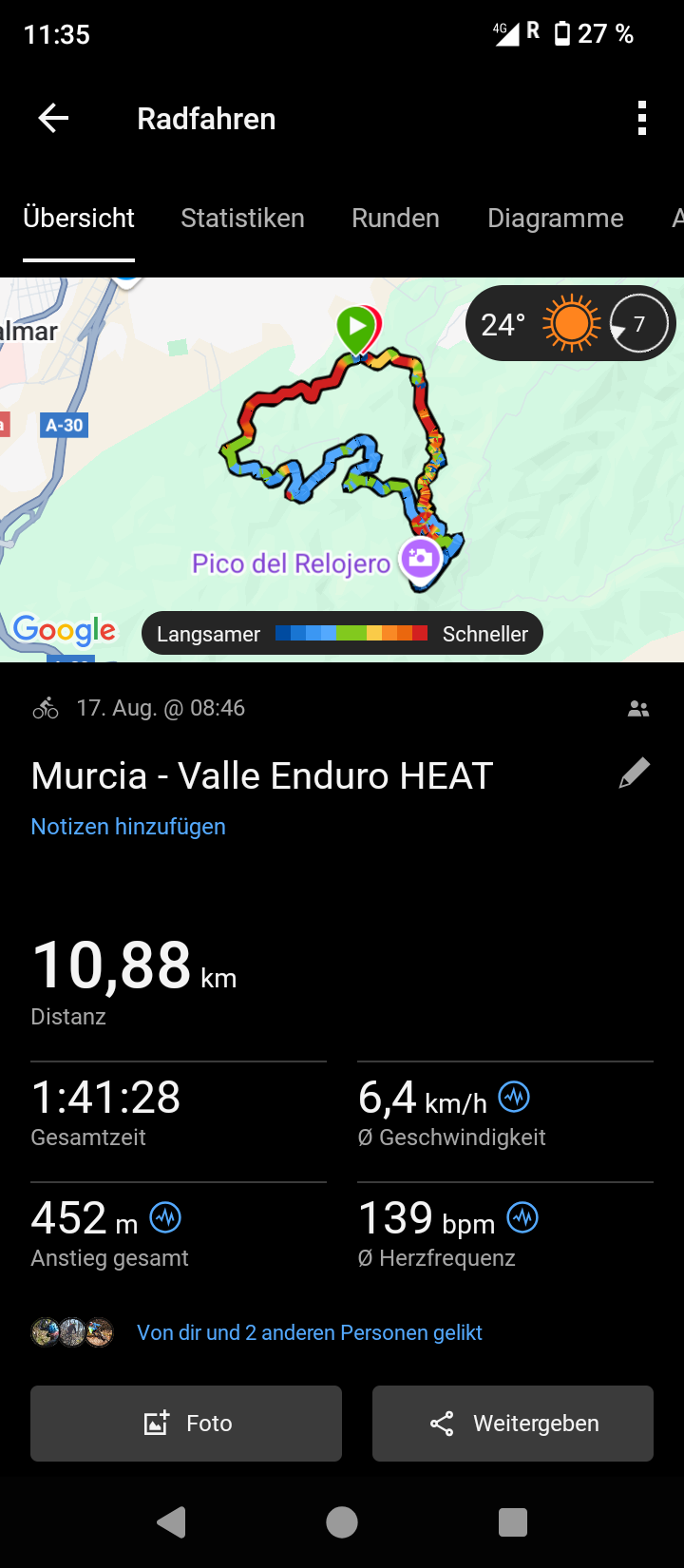 Ein bisschen was zum zeigen gibt es dann doch noch. In Murcia war es in erster Linie brutal heiß die Tage, doch auch irgendwie eine tolle Gegend so nah an der Stadt, aber dennoch so weit weg von allem was Stadt so ausmacht. Das Valle ist das Naherholungsgebiet in Murcia für alle die es bergig mögen. Morgens, wenn das Thermometer noch unter der 30er Marke steht, triffst du hier jede Menge Trailrunner, Mountainbiker und Wanderer. Da simmer dabei! Ich fahre zwei Tage jeweils morgens, da es ab 11Uhr schon wild warm ist und alles was danach noch passiert am Tag, mit nichts tun und die Hitze aussitzen zu tun hat. Ein paar Tage mit 40°C und mehr können einen wirklich mürbe machen und sind, je nach Stehplatz des Womo echt eine Herausforderung, sowohl körperlich als auch mental und für´s Material. Der Kühlschrank ist dezent überfordert! Die Trails im Valle sind richtig gute, rote Enduros. Rechts am Trail uraltes Wrack, welches wohl vermutlich irgendwann von der Straße weiter oben abkam und gefallen ist. Das Fabrikat war nicht mehr zu erkennen für mich...
